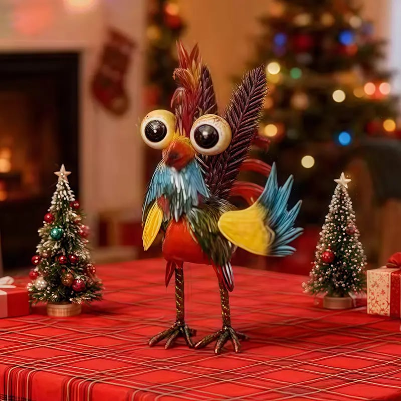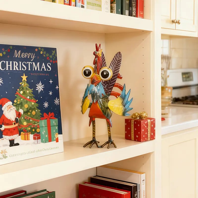 Hand-painted metal rooster, vibrant colors, farmhouse rustic style, full of artistic flair, eye-catching wherever you place it! 🎨